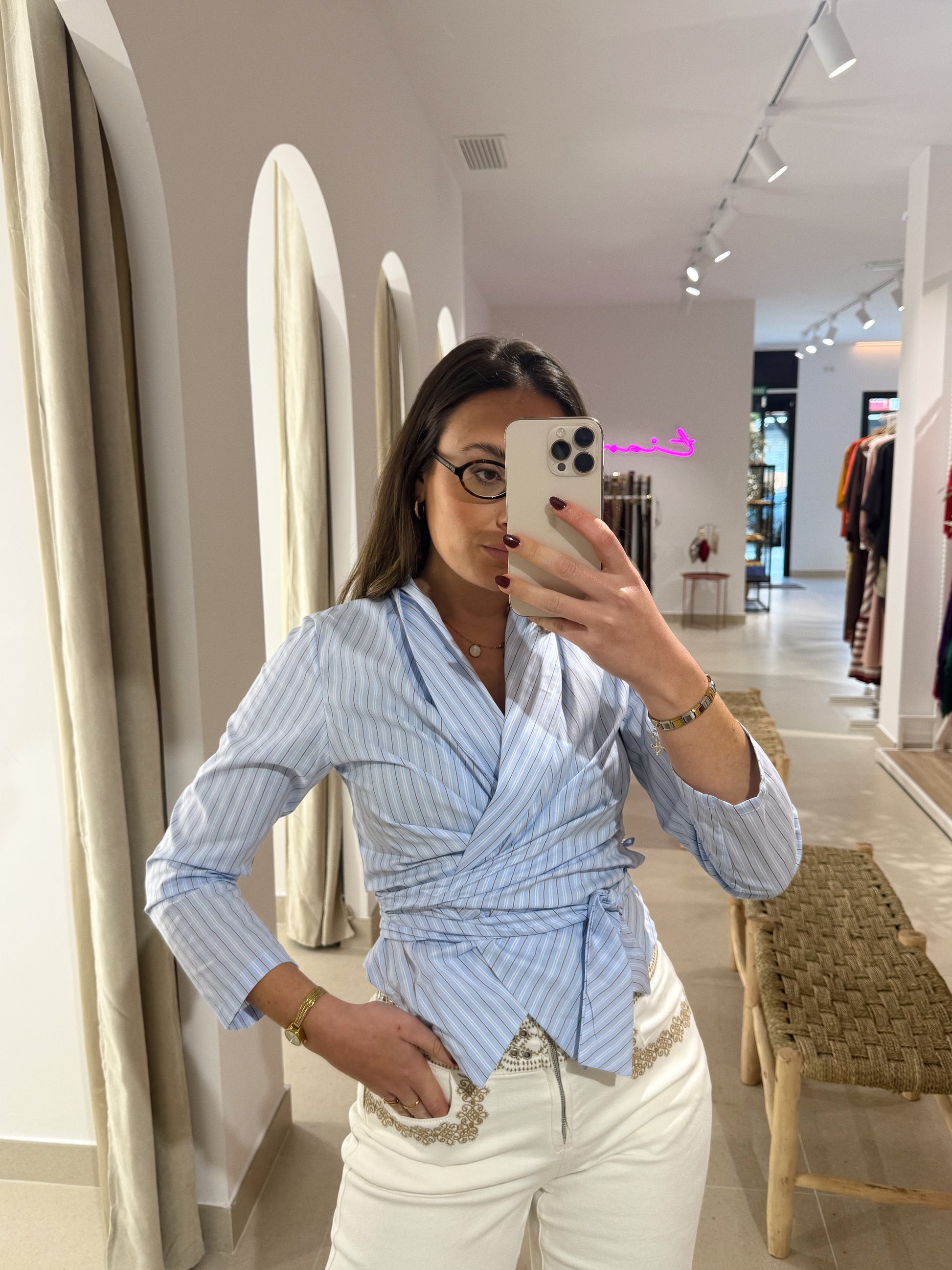 BLUSA CRUZADA CELESTE RAYAS